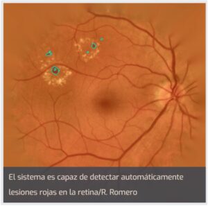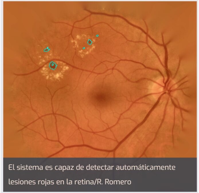 La investigación conjunta realizada por el instituto de Oftalmobiología Aplicada (IOBA), investigadores del Grupo de Ingeniería Biomédica (GIB) y del Instituto de Investigación de Matemáticas (IMUVA) de la Universidad de Valladolid (UVA), y en colaboración con compañeros del Hospital Clínico Universitario de Valladolid y del Instituto de Neurociencias de Castilla y León (INCYL), permite detectar de forma automática lesiones rojas en la retina a partir de imágenes digitales a color del fondo de ojo.